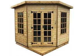 The corner pent summerhouse is a flat top roofed summerhouse that has 2 doors as standard. This summerhouse is pressure treated in tanalised green.
